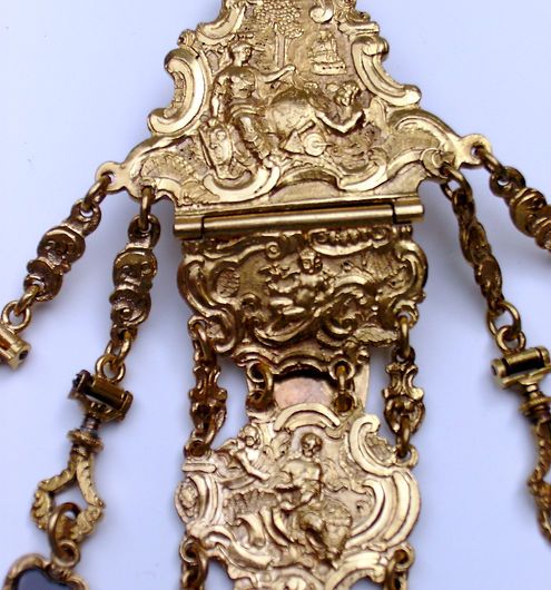 4-stufige vergoldete Bronzechatelaine, Außenbereiche mit Voluten und Ranken, mittig verschiedene mythologische Szenen, ergänzt mit Früchten, Anhängeketten versehen mit goldenem Kurbelschlüsse und dreiteiligem Anhänger mit Blutjaspis, Achat und Karneol
